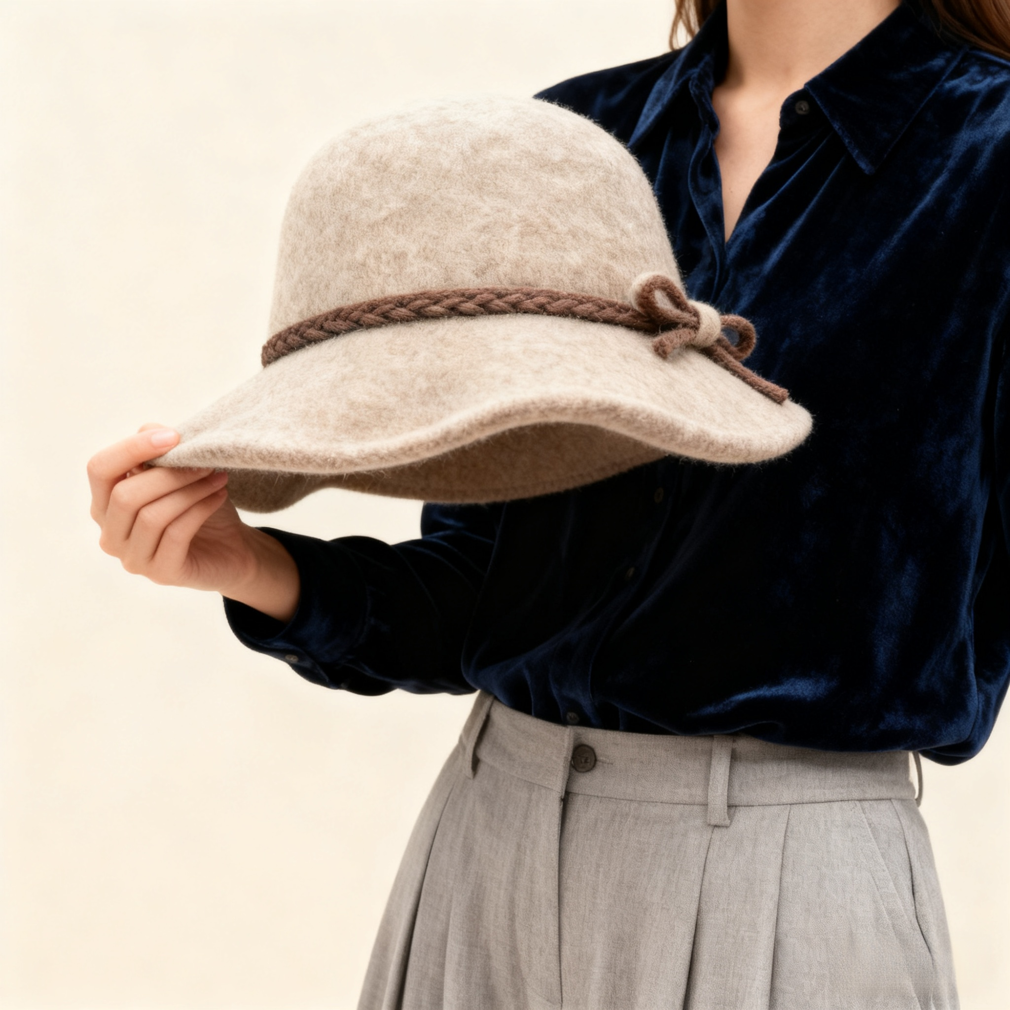 넓은 챙과 리본 디테일 모자